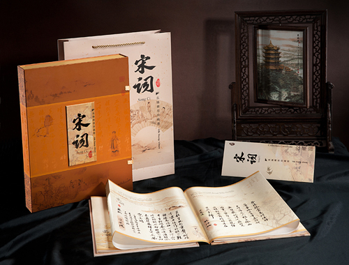 真丝邮票珍藏册《宋词》所选词作皆为婉约、豪放之名作,各具风格。我们以国画、书法、邮票为原料,以丝绸为载体,采用公司独创的高分辨率全彩色真丝印制技术及真丝册页的装帧技术,将这些词作呈现在柔滑的丝绸上,诵读这些词作时,可以受到多层次的艺术感染和美的熏陶。