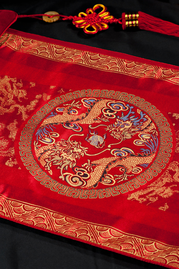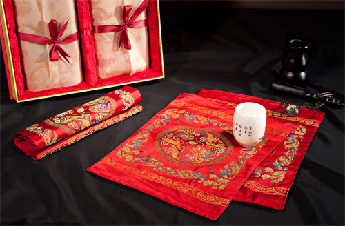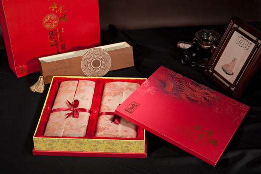 龙凤是中华民族欢庆吉祥的象征,是和谐美满的体现。在此壬辰龙年到来之际,我公司特推出新产品——真丝织锦桌旗套装《凤舞龙蟠》。该桌旗套装画芯图案采用历代精品龙凤纹为主图,配以各种龙凤线纹、云纹,玉饰等代表吉祥的配件,绚丽的色彩、大气的构图,配合精湛的织锦技术生动展现了数千年中华龙凤文化的精魂,是商务馈赠、婚庆节日的绝佳礼品。