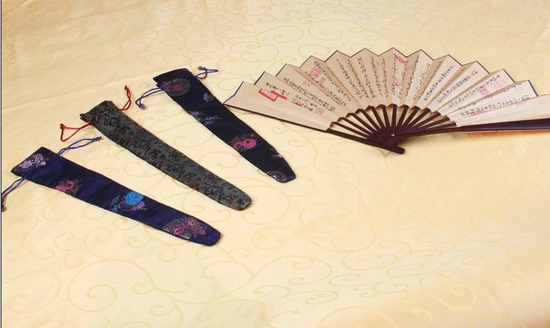 锦布扇套,古代的扇子是竹编,木头,羽毛,丝绸做成的,扇套起到保护扇子作用。历来文人墨客喜欢在扇子上面题诗作画,雕刻,刺绣,锦玛绣借助做工精美兼具实用性的锦布扇套传承了这种传统文化