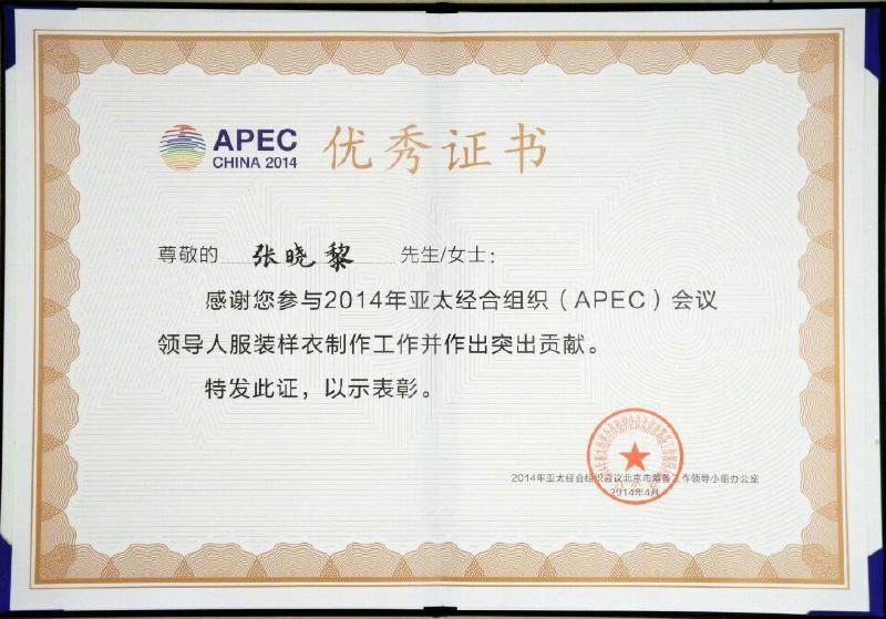 10日,参加APEC领导人非正式会议的各经济体领导人、代表及配偶,身着特色中式服装集体亮相,因为忙着筹备时装展,张晓黎并没有注意到这个消息。团队的成员告诉她,亮相的正式服装中,跟她设计样衣的元素和理念,都很契合,包括色彩、剪裁方法等,这让她感到非常高兴。同时,她也收到组委会颁发给她的“优秀证书”和“纪念证书”,感谢她参与APEC会议领导人样衣制作工作并作出突出贡献。